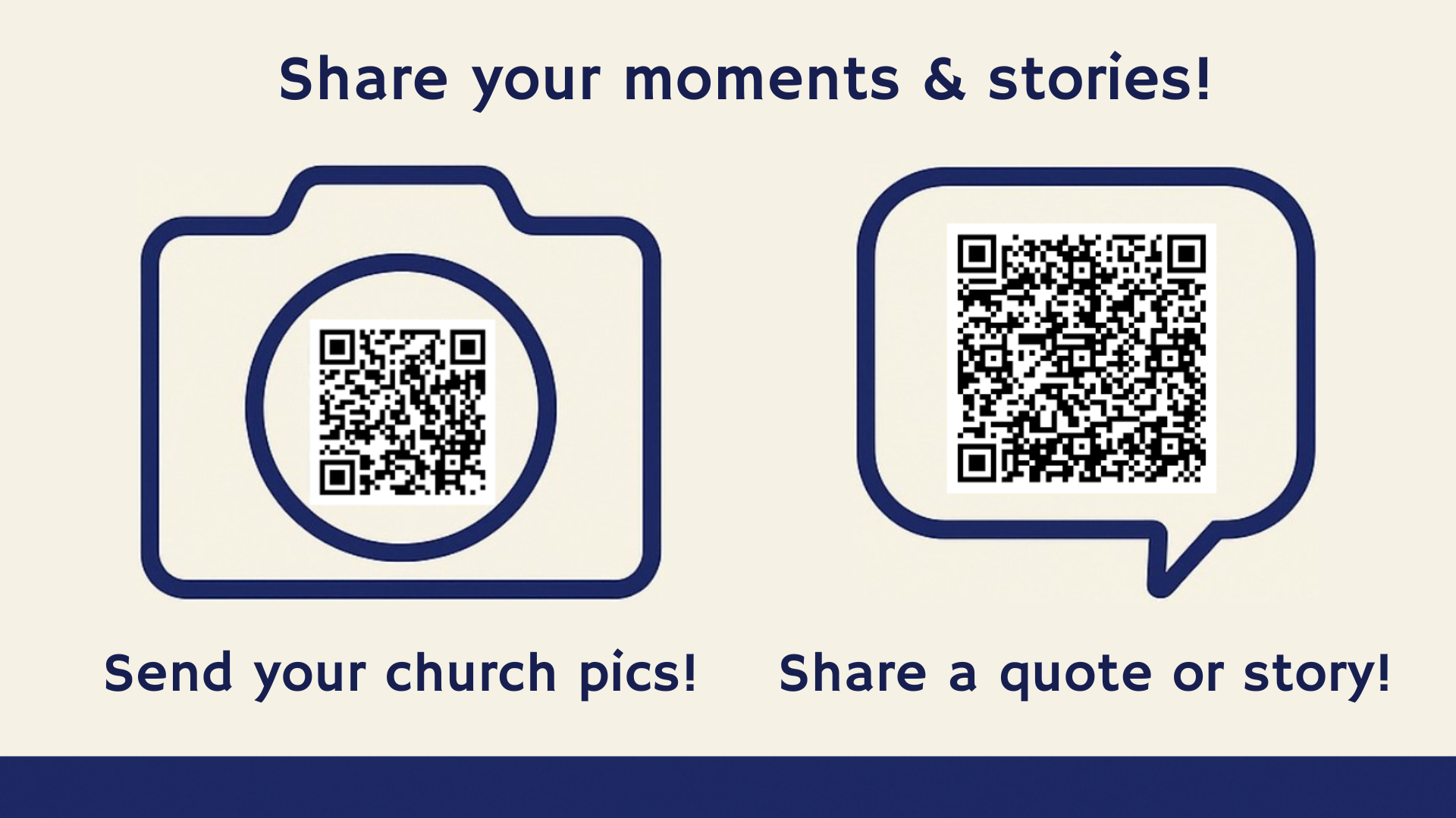 All congregants are invited to take part in NaperCov’s social media presence. Using the QR code in the camera outline, you’re invited to share pictures that capture the life of our church, such as those from a worship service, community life event, bible study/small group, etc. Using the QR code in the text bubble outline, you’re invited to share quotes or stories you find meaningful, such as a favorite part of the sermon, something that encouraged you, or a way you’ve seen God at work in our church. Sharing your pictures and stories helps us highlight real people and real stories in our church’s posts and updates. This is a simple yet impactful way to show what God is doing in our community.