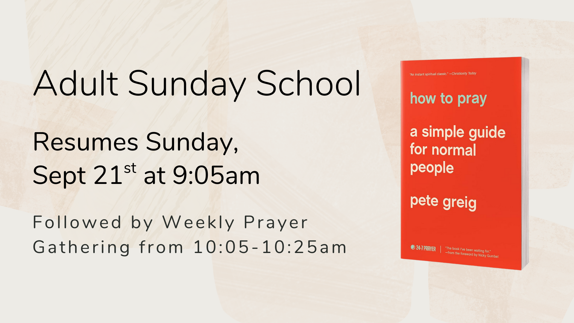 Beginning Sunday, September 21st at 9:05 a.m., we will begin a series on prayer using the book How to Pray: A Simple Guide for Normal People by Pete Greig. Each week we will delve deeper into different aspects of PRAY (Pause, Rejoice, Ask, Yield), which also provides the structure of our weekly prayer meetings on Sunday morning from 10:05 a.m. to 10:25 a.m. Both the study and our weekly prayer gathering will meet in the library.