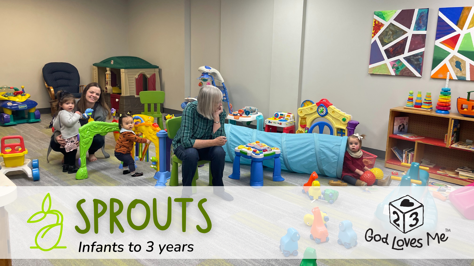 Every Sunday morning we have staff and volunteers ready to welcome newborns, babies, and toddlers (up to 36 months of age) to our nursery space. Young ones love to play and interact with caring adults. We use God Loves Me, a very simple storybook curriculum each week intended for 2-3 year olds to introduce our youngest disciples to a variety of Bible stories.